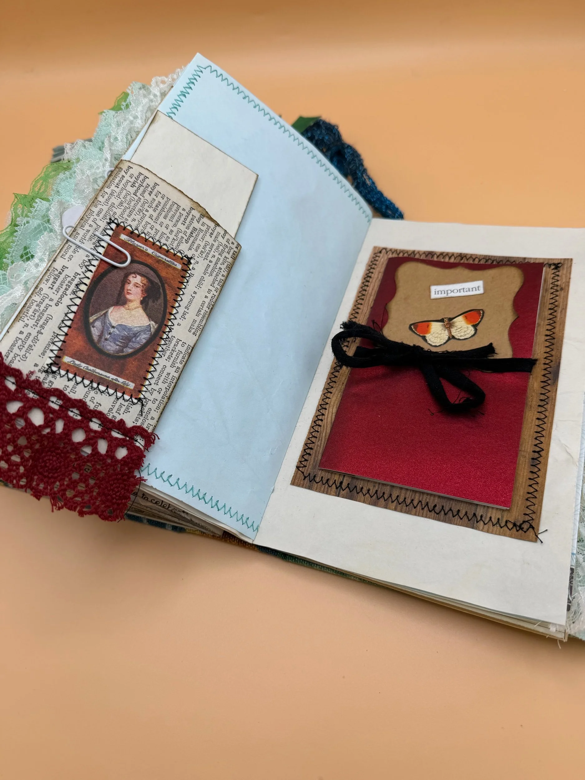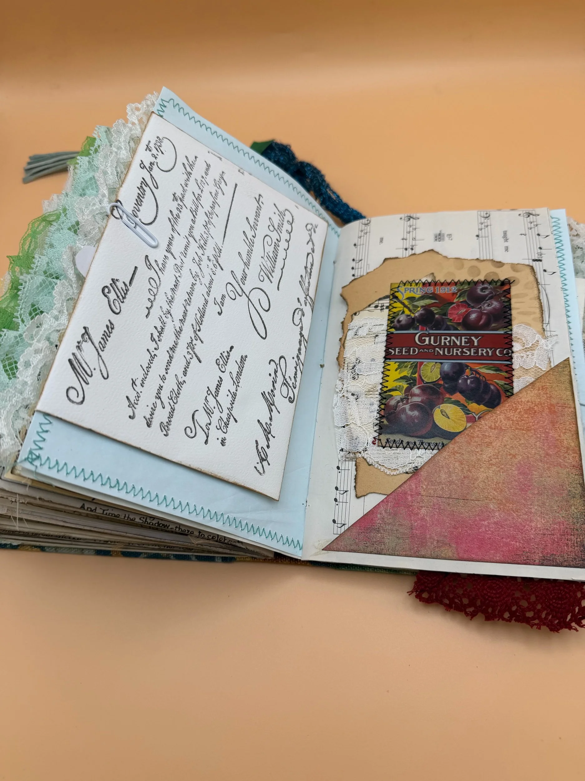 Inside you’ll find a mix of quality writing pages along with handmade and vintage ephemera tucked throughout — things like pockets, tags, journaling cards, layered papers, and unique old-world pieces that add character and spark creativity. Every page turn gives you something a little special while still leaving plenty of space to write.