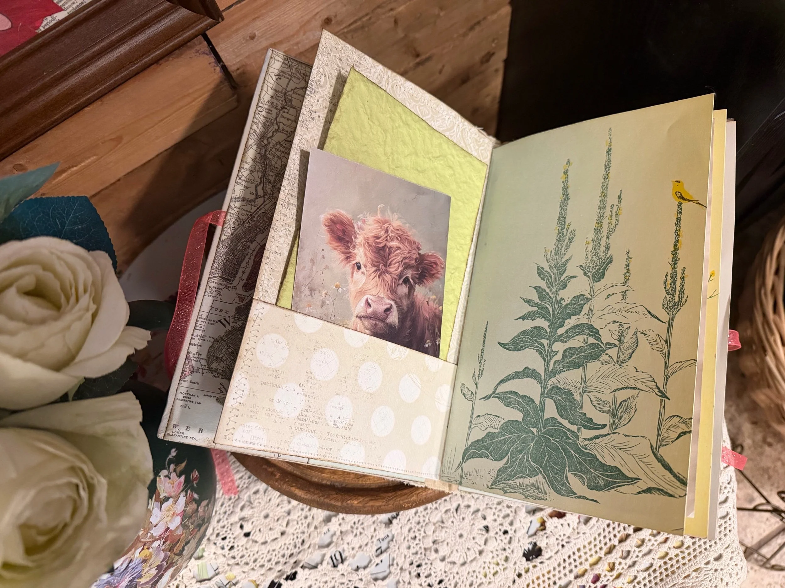 This one-of-a-kind, handmade writing journal is filled with charm, texture, and creative surprises. With 48 thoughtfully curated pages, it’s designed for capturing your thoughts, stories, prayers, plans, and everyday inspiration — with lots of beautiful details along the way.