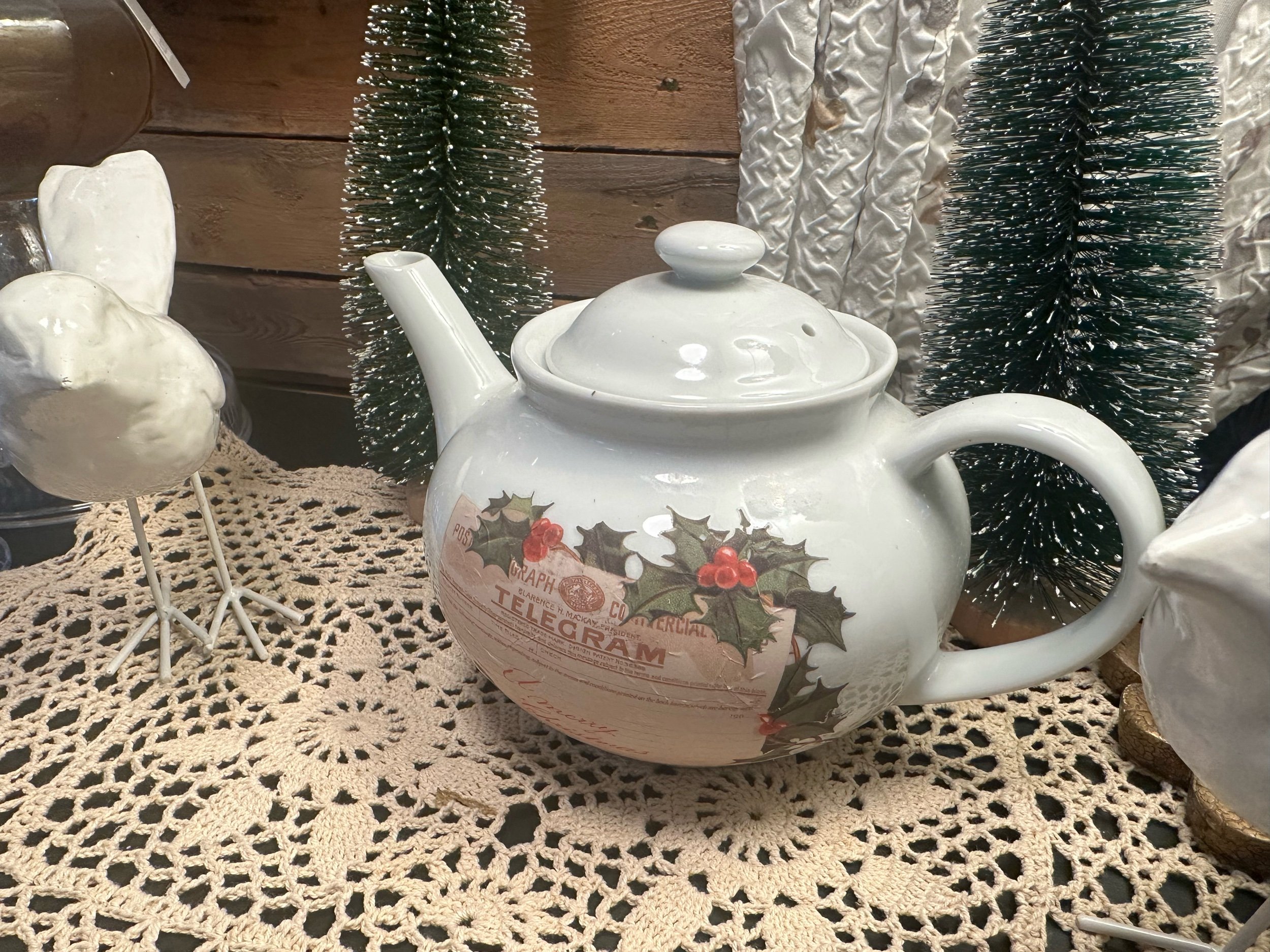 Home Decor Finds › Christmas Telegram Teapot Image 1 of 3 Image 2 of 3 Image 3 of 3 Christmas Telegram Teapot $12.99 Only 1 left in stock Add To Cart Added! Reviews Reviewer Name Review Date Star Rating Description Posted on Etsy Product Show More